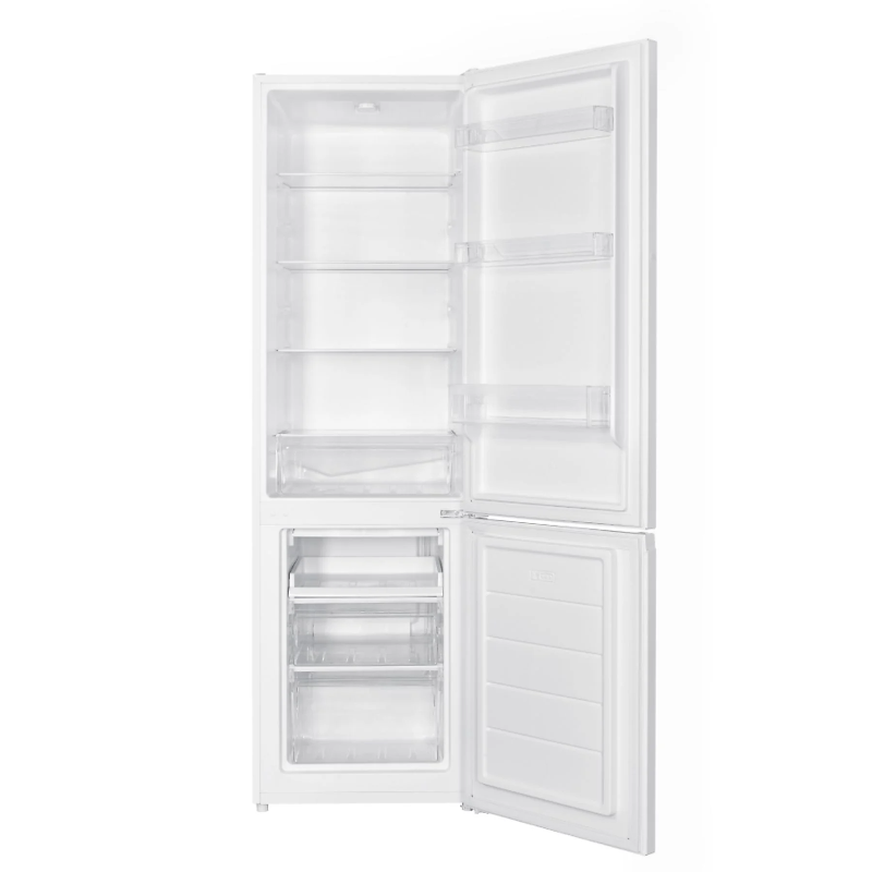El frigorífico combinado OK OFK 651 E W tiene una capacidad total de 262 litros, distribuidos en el refrigerador y el congelador. Su diseño incluye un compartimento frigorífico y un compartimento congelador, lo que permite la conservación de alimentos de diferentes tipos. Este modelo cuenta con estantes ajustables, lo que facilita la organización del espacio interior. El sistema de refrigeración es por aire forzado, lo que garantiza una distribución uniforme de la temperatura en su interior. Incorpora un sistema de descongelación automática en el compartimento frigorífico, lo que minimiza la formación de escarcha. La eficiencia energética de este aparato está clasificada en la clase E, lo que se traduce en un consumo eléctrico moderado. El frigorífico dispone de luces LED en el interior, proporcionando visibilidad en el almacenamiento de los alimentos. Además, el modelo presenta controles mecánicos para la regulación de la temperatura. Su diseño contempla un espacio para almacenar botellas, evitando que se deslicen. El congelador tiene un rendimiento de congelación de 2 kg/24 horas. La puerta del frigorífico se puede colocar en cualquiera de los lados, lo que permite una instalación versátil en diferentes espacios. Este electrodoméstico es apto para la conservación de productos frescos, carnes, lácteos y vegetales, siguiendo las directrices de almacenamiento adecuadas.