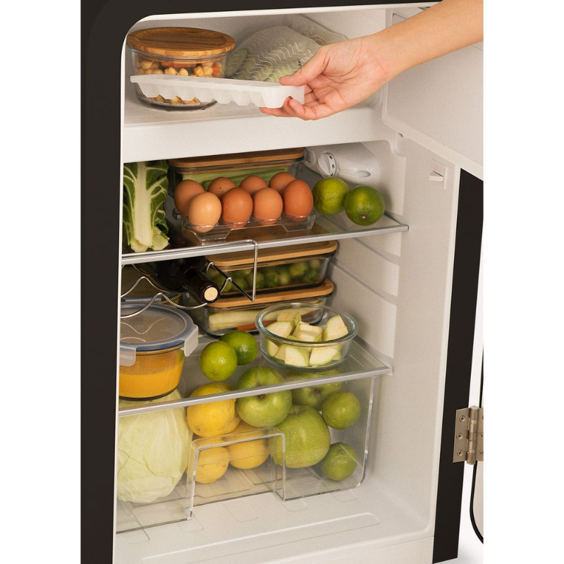 El frigorífico Create 107L Negro F cuenta con una capacidad total de 107 litros, dividido en un compartimento frigorífico y un congelador. Tiene un diseño de 2 puertas, donde el compartimento superior es el frigorífico y la parte inferior corresponde al congelador. Este electrodoméstico opera con un nivel de ruido de 40 dB, lo que lo clasifica como un aparato de funcionamiento silencioso. Su sistema de refrigeración es electrónico, lo que permite una distribución uniforme de la temperatura. Este modelo incluye estantes ajustables, los cuales ofrecen flexibilidad en la organización de los alimentos. La energía se suministra a través de una fuente eléctrica estándar. Dispone de un sistema de descongelación manual en el compartimento del congelador. Además, tiene una iluminación interna que facilita la visibilidad del contenido. El frigorífico incluye una bandeja para frutas y verduras, así como compartimentos en la puerta para almacenar botellas y otros productos. Los materiales utilizados en su fabricación son metales y plásticos, garantizando un mantenimiento simplificado. El frigorífico está diseñado para ser colocado en espacios cerrados, cumpliendo con los estándares de eficiencia energética que requiere la clasificación F. Este artículo no incluye características adicionales, como dispensadores de agua o hielo.