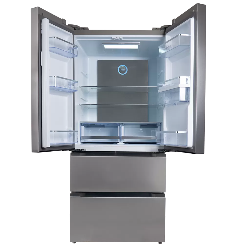 El Frigorífico Infiniton FRD-83IX 506L No Frost Inox Americano E cuenta con un diseño de doble puerta y un sistema de refrigeración No Frost. Tiene una capacidad total de 506 litros, que se distribuye entre el área de refrigeración y el compartimento de congelación. El compresor ofrece un funcionamiento constante que asegura la temperatura adecuada en ambas secciones. El interior está equipado con estantes de vidrio regulables, lo que permite organizar los alimentos de manera eficiente. También dispone de bandejas para verduras y compartimentos especializados para productos lácteos y botellas. El frigorífico incluye un dispensador de agua externo que permite acceder fácilmente a agua fría. Sus dimensiones son compatibles con la mayoría de los espacios en cocinas estadounidenses. Presenta un sistema de iluminación LED que proporciona visibilidad en el interior. El electrodoméstico cuenta con una clasificación de eficiencia energética E, lo que indica su consumo energético. La puerta es reversible, lo que otorga flexibilidad en la instalación y ubicación del mismo. El Infiniton FRD-83IX está diseñado para funcionar a una temperatura ambiente que puede variar desde los 10°C hasta los 43°C, asegurando un rendimiento adecuado en diversas condiciones. Este frigorífico es apto para el almacenamiento de alimentos frescos y congelados, manteniendo un entorno controlado para preservar su estado.