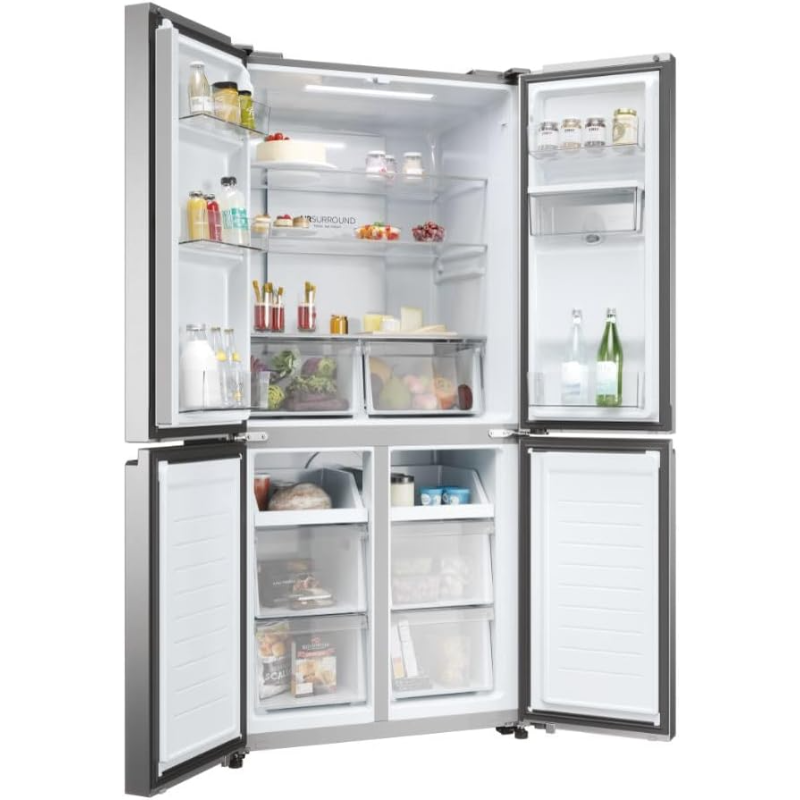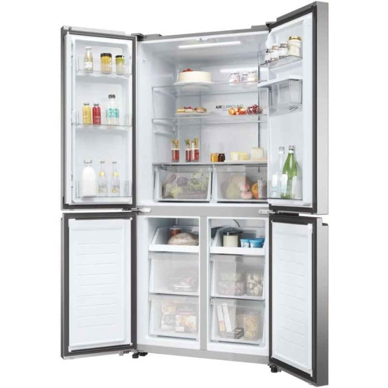 El frigorífico americano Haier HCR3818EWMM cuenta con una capacidad total de 463 litros. Su sistema de refrigeración incluye tecnología No Frost que impide la acumulación de escarcha. Este modelo presenta un sistema de enfriamiento en la parte superior y un sistema de congelación en la parte inferior. Dispone de dispensador de agua en la puerta y un sistema de filtración integrado. El interior presenta estantes de vidrio templado que son ajustables en altura. La iluminación del interior es LED, lo que ofrece una mejor visibilidad. El frigorífico tiene un compresor convencional y una construcción de acero. Sus dimensiones permiten la instalación en una variedad de espacios. Todos los compartimentos de almacenamiento son accesibles y están diseñados para el almacenamiento de alimentos y bebidas. Tiene un control digital de temperatura que permite ajustes precisos, y su diseño incluye dos puertas con apertura independiente para el refrigerador y el congelador. El frigorífico cuenta con un sistema de alarma que se activa en caso de que la puerta permanezca abierta por un tiempo prolongado. La clasificación energética del dispositivo es de clase E. Este producto cumple con las normativas de eficiencia energética y es adecuado para diversas ubicaciones sin restricciones específicas.