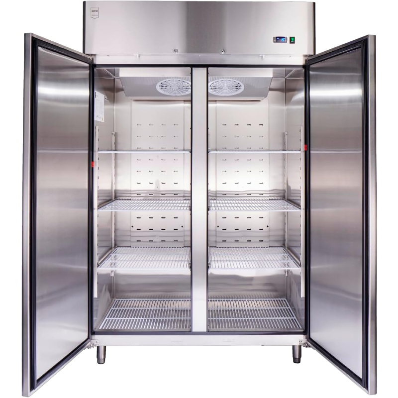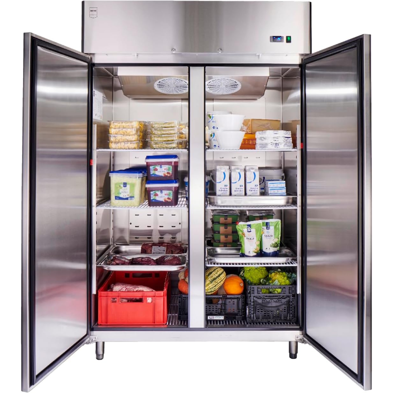 El frigorífico METRO Professional GRE1400 940L está fabricado en acero inoxidable y tiene una capacidad de 940 litros. Este modelo incluye puertas con cierre hermético y estantes ajustables, permitiendo el almacenamiento flexible de alimentos. Su sistema de refrigeración es por compresor y cuenta con un termostato digital que permite regular la temperatura de manera precisa. Tiene una clasificación de energía de Clase E, lo que implica un consumo energético determinado. El dispositivo es apto para el almacenamiento de productos alimenticios, y su diseño incluye un sistema de desagüe para el agua de descongelación. Integra luces LED en el interior para una mejor visibilidad de los contenidos. Presenta un sistema de refrigeración constante que mantiene una temperatura estable en el interior. Su estructura está diseñada para facilitar la limpieza y el mantenimiento. Incluye ruedas para un desplazamiento sencillo y manijas en las puertas para un acceso fácil. Este frigorífico es adecuado para su uso en entornos de almacenamiento de alimentos.